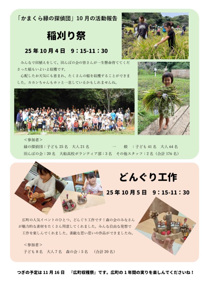 10月は稲刈り祭、どんぐり工作を行いました。ご参加いただきありがとうございました!
